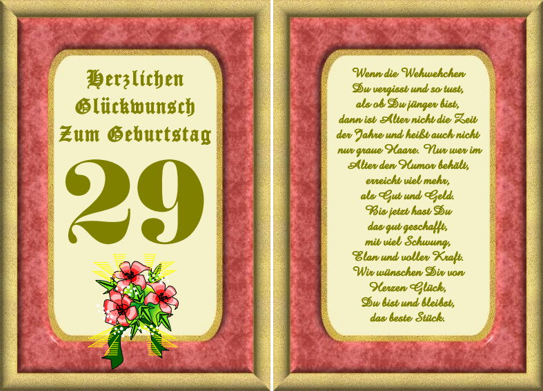 Zitate und sprüche zum 29. Gedichte und sprüche am 29. Geburtstag glückwünsche herzliche glückwünsche zum 29. Am 29.02.2024 geborene kinder sind erst 9 monate bzw. Hallo du da, werd mal wach, heut ist wieder mal dein tag.